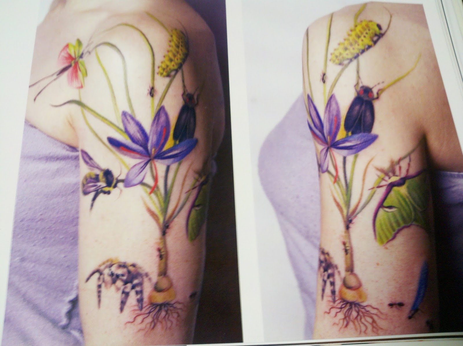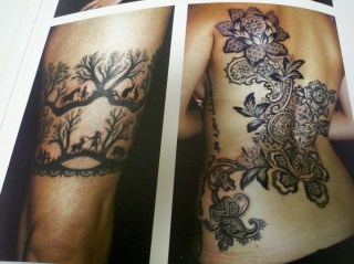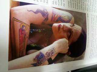 Anyway, shortly after I came home, I ran across this book: Bodies of Subversion: A Secret History of Women and Tattoo [http://www.amazon.com/Bodies-Subversion-Secret-History-Tattoo/dp/1576876667/ref=sr_1_1?s=books&ie=UTF8&qid=1375814485&sr=1-1&keywords=bodies+of+subversion], and since I had just been with Kenny, I ordered it through our library so I could check it out. I have to say, I thought it was really, really interesting [and, OK, I have to admit–even though I don’t have a tattoo, I’ve always kind of liked them–and I think the beautiful, colorful ones are really lovely]. Here are a couple pictures from the book: