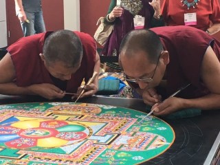 Let me start with a few miscellaneous pictures. I think I mentioned [and included a picture] of the sand mandala that the Tibetan monks were building–here it is again, much closer to completion. I won’t be here for it, but tomorrow there will be a service where it is destroyed, and some of the sand distributed to the audience, and then the rest poured into the nearest body of water. [At least, that is what usually happens.] It is really amazing to watch: such painstaking, patient work.