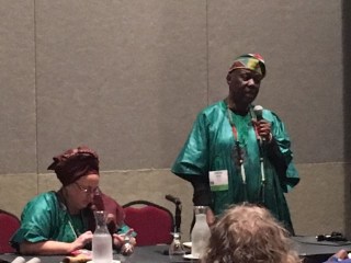 One of the most interesting sessions I attended today was on the Yoruba tradition. The two presenters were both Yoruba priests–a married couple, Wande Abimbola and Ajisebo Ogunninhun Abimbola. [They were the ones who were supposed to do the ritual yesterday morning, too–but I didn’t hold it against them!] Wande has his Ph.D. in Yoruba literature, and was installed as Spokesperson of Ifa for the world by a council of Babalawos [high priests] in 1981. Ajisebo is also an Ifa priest. They introduced the Yoruba religion, and also shared some traditional chants with us. One of the things they said that I really liked was that the number of Yoruba divinities traditionally is said to be “400 + 1”: the “plus one” refers to the inclusive nature of the religion, and the fact that it is always open to learning about another’s god. I also appreciated what Wande said about reading and writing. He challenged the traditional idea that people who can’t read and write are “primitive.” Instead, he said, it’s reading and writing that makes you “dumb,” because you write things down instead of internalizing them [memorizing them] and making them part of you. He has a point….