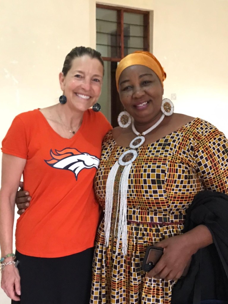 Winnie giving Beth a kitenge with the pattern of the Women’s development team at the church