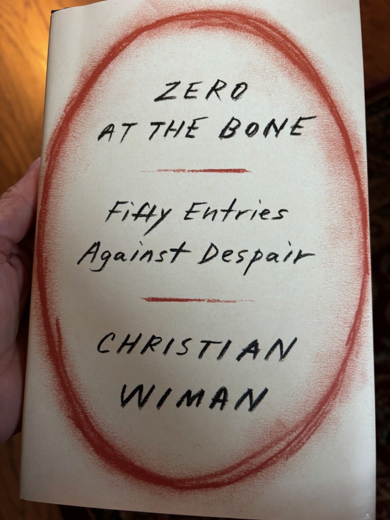 I read this book after reading an article about it in The New Yorker. Wiman is a poet, and is fighting a rare form of cancer. He is still alive beyond when the doctors all said he should be dead. In this book, he offers poems, personal reflections, quotes and other short meditations that combine a stubborn [if unconventional] Christian faith, an in-your-face staredown with death, and what I suppose could be called hope, if you squint when you look closely. They may be entries against despair, but they are certainly entries that feel the presence of despair breathing down the neck.